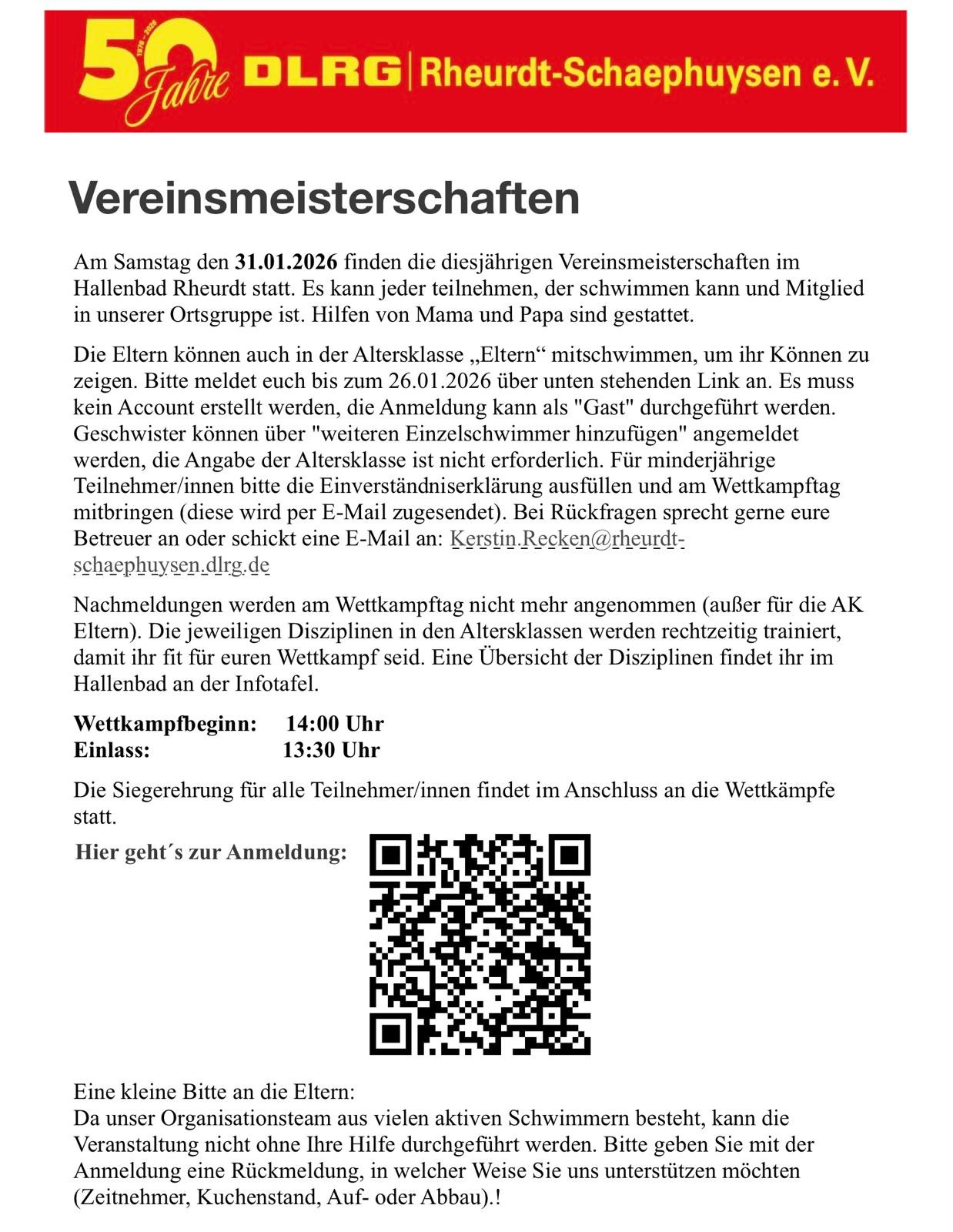 Am Samstag den 31.01.2026 finden die diesjährigen Vereinsmeisterschaften im Hallenbad Rheurdt statt. Es kann jeder teilnehmen, der schwimmen kann und Mitglied in unserer Ortsgruppe ist. Hilfen von Mama und Papa sind gestattet.